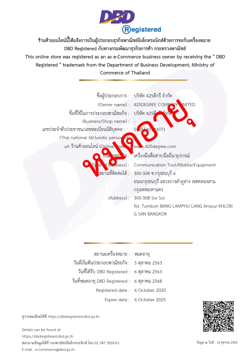 - **ผู้ซื้อต้องเก็บกล่องบรรจุภัณฑ์เพื่อใช้ในการยืนยันในการซื้อสินค้ากับทางร้าน 425Degree กรณีที่อยู่ในการรับประกัน